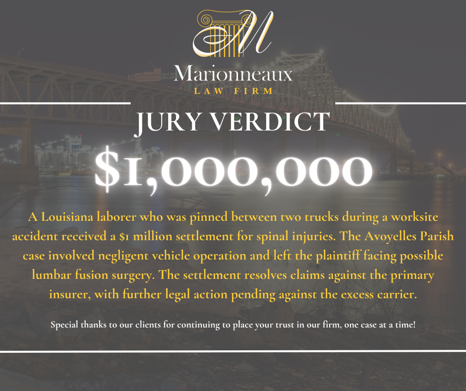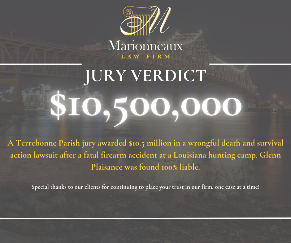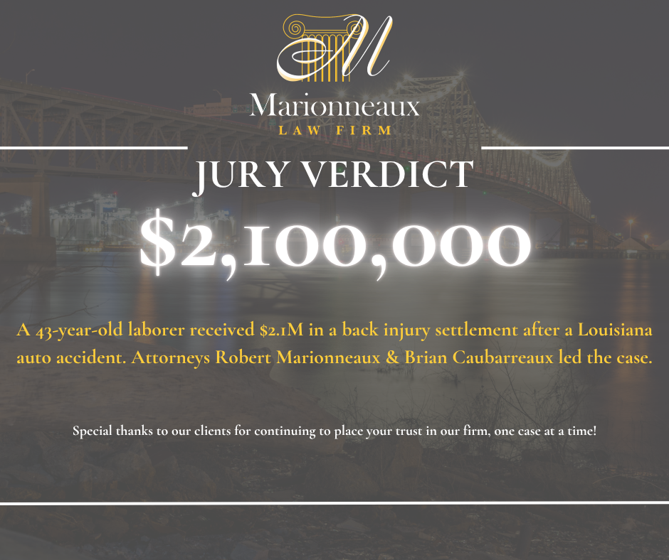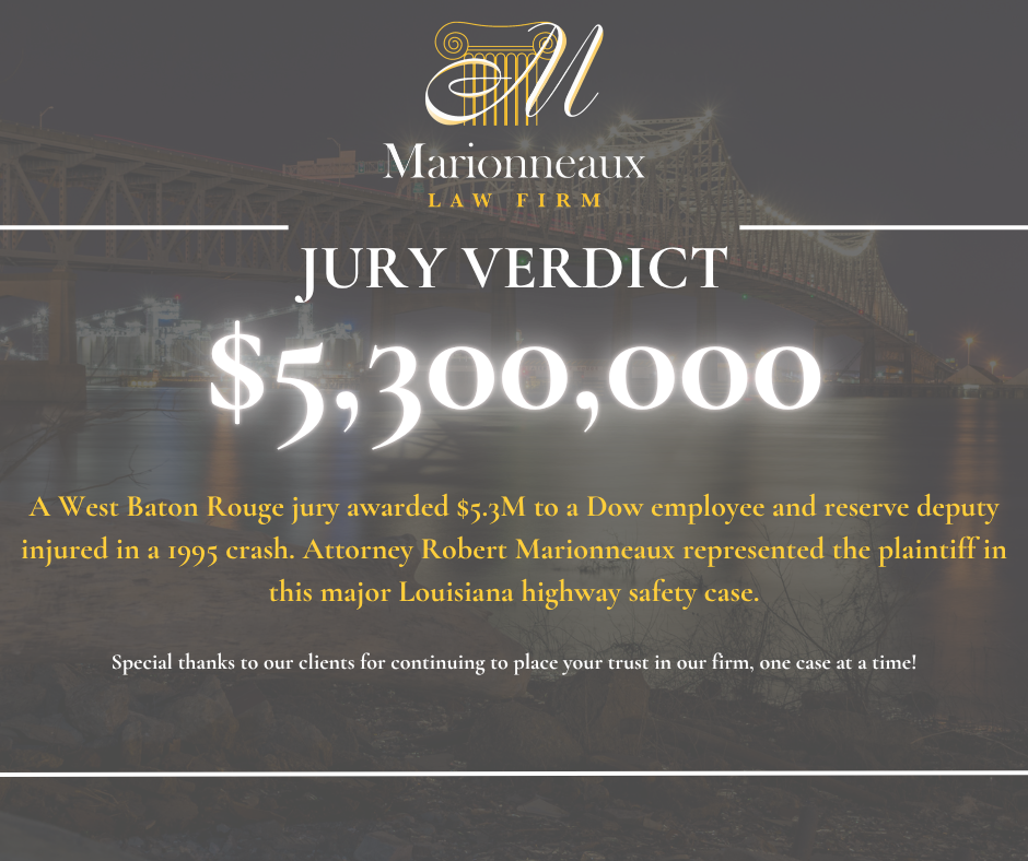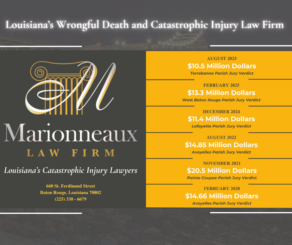Since 1995, the Marionneaux Law Firm has been lead counsel in numerous multi-million dollar jury verdicts. These cases have ranged from wrongful death, catastrophic injury from negligent 18-wheeler operators, and cases involving contamination of a drinking water aquifer by a large chemical company, explosion and fire injury, and automobile defect cases.